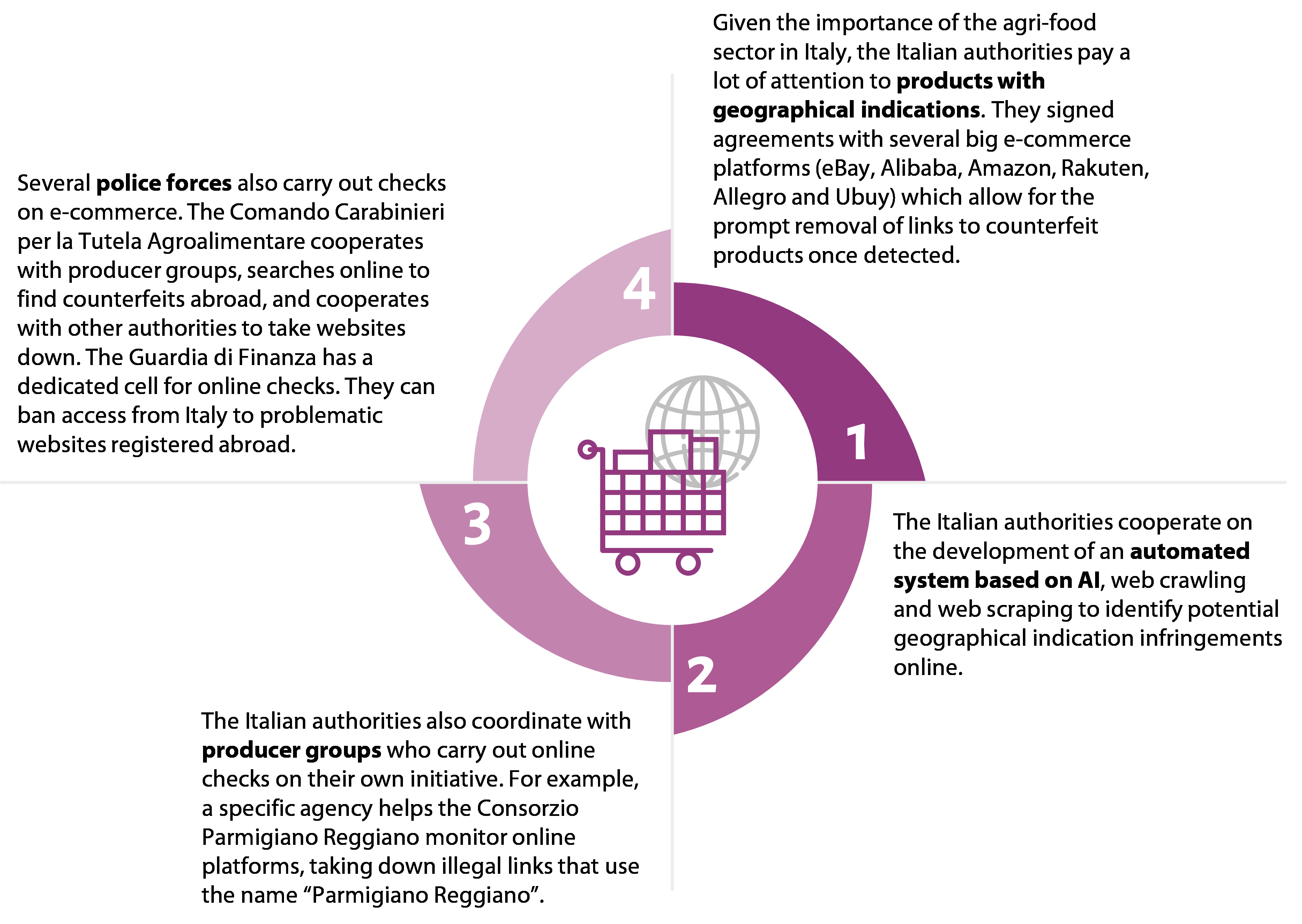 92 There are only limited checks for online retail, although sales are increasing. These checks are difficult to carry out when sales are concluded through websites registered in the EU, and almost impossible when they involve non-EU countries. Italy, one of our selected member states, has a more elaborate approach than the other member states we covered to checking e-commerce, which we consider to be good practice (paragraphs 71-72).