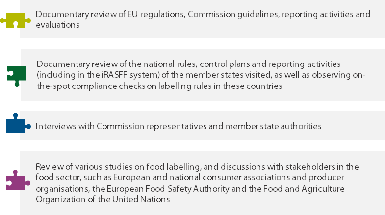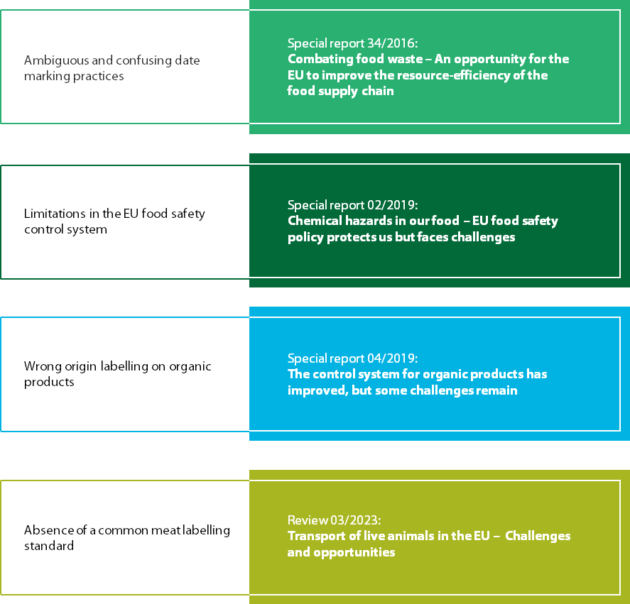12 Previous ECA work has not specifically covered the topic of food labelling. However, our audit complements earlier reports. In 2019, we looked at how food safety policy protects citizens from chemical hazards7 and at the control system for organic products8. We also addressed date marking in our special report on food waste9 and meat labelling in a recent review on the transport of live animals10 (see Figure 4).