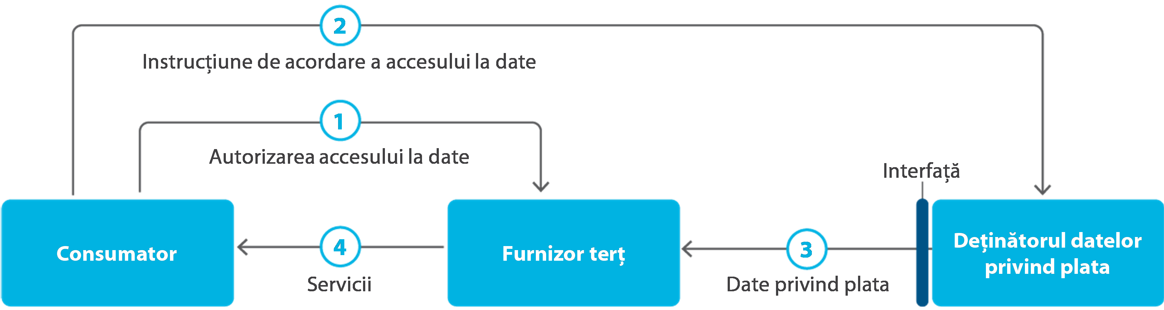 46 Schimbul de date este facilitat prin interfețe (a se vedea figura 5), care permit comunicarea securizată între deținătorii de date privind conturile și furnizorii terți. DSP2 permite deținătorilor de date privind conturile fie să creeze interfețe specifice – cunoscute și sub denumirea de interfețe de programare a aplicațiilor –, fie să autorizeze utilizarea interfețelor pentru clienți. În acest din urmă caz, furnizorul terț se comportă ca un client utilizând pagina de internet standard a băncii pentru clienți pentru a accesa contul de plăți. Atunci când un furnizor terț utilizează interfața pentru clienți, acesta trebuie să se identifice în mod clar.
